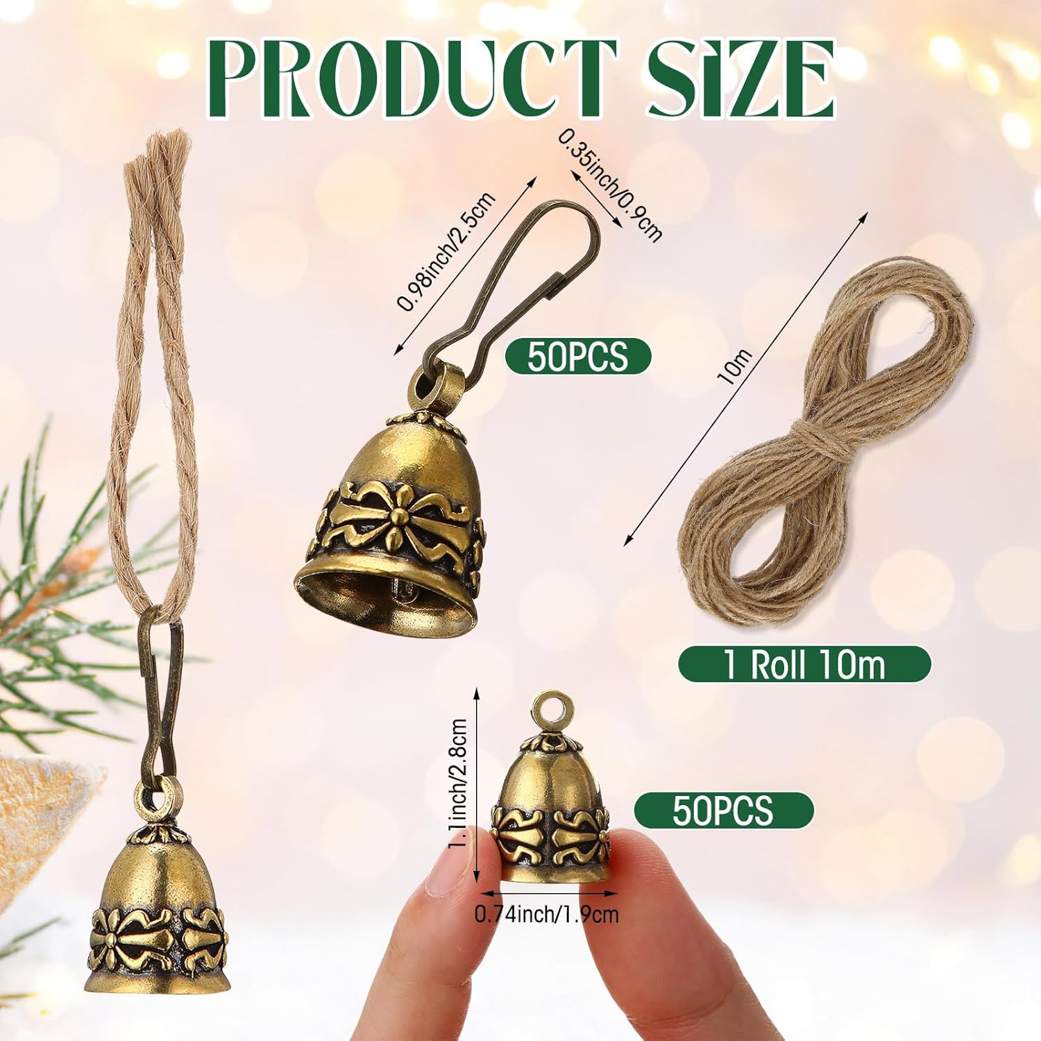 Features: The vintage design of the mini bells, with their antique bronze color and classic pattern, adds a touch of elegance to your decor. Bronze jingles are versatile and can be applied in crafts, wedding decorations, holiday gifts, and creative DIY projects. Specifications: Material: Bells: copper Color: mainly bronze Size: Bells: about 1.8 cm/0.7 inches in diameter Hook: about 25 mm long Jute twine: about 3 mm x 10 M Package includes: 50 x Bells 50 x Hooks 1 x Jute rope Notes: Manual measurement, please allow slight errors on size. The color may exist a slight difference due to different screen displays