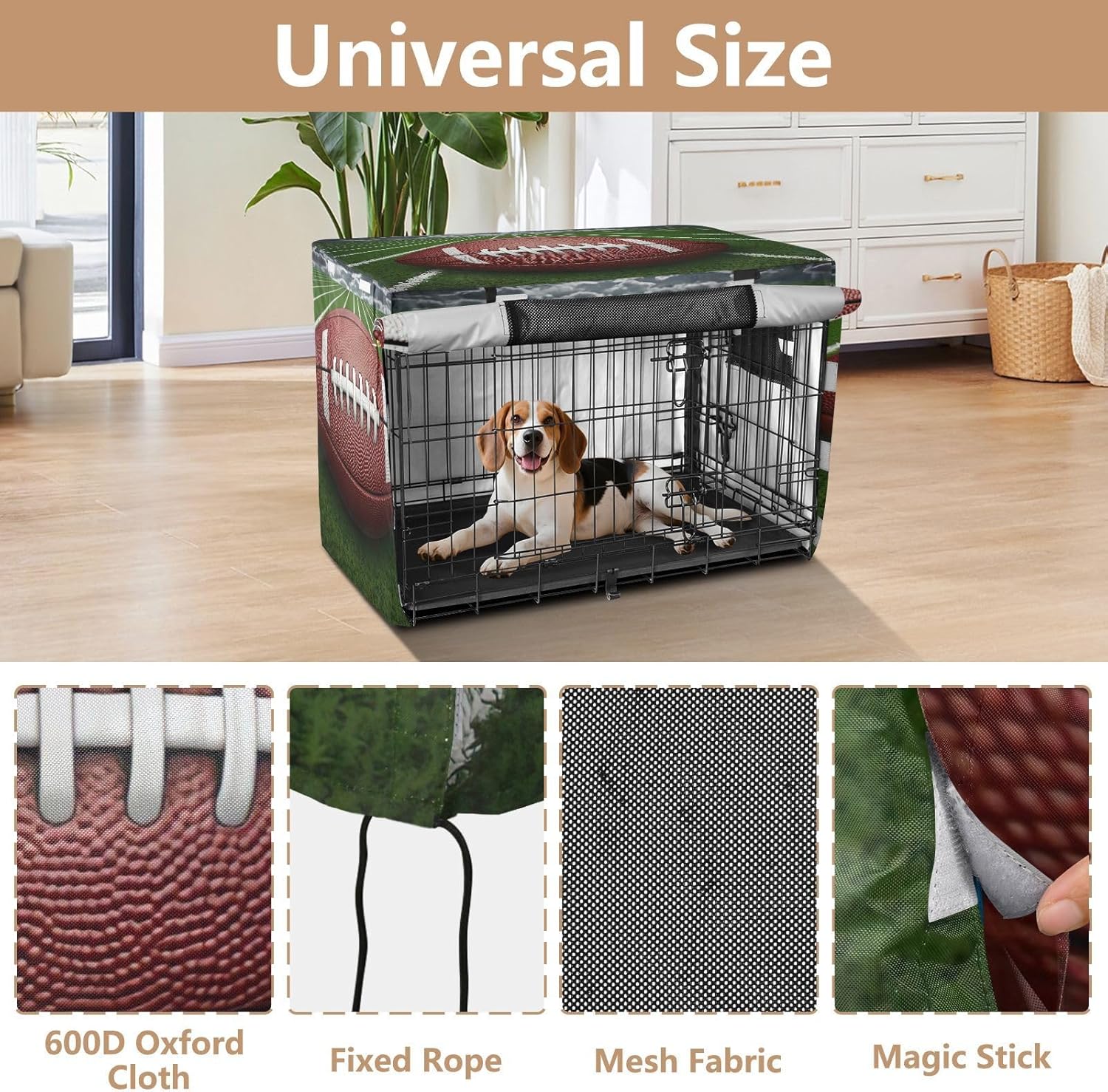 Weather-Resistant Dog Crate Cover is made of 600D silver-coated oxford fabric that provides exceptional protection against wind, rain, and sunlight. This material prevents your pet from scratching the crate and blocks most direct sunlight, ensuring a safe and comfortable space.Simple and Secure Setup features an easy fastening system, making it effortless to install without the need for tools. This breathable pet cage cover fits securely onto your dog crate, ensuring it stays in place and provides protection at all times.Ventilation for Comfort with mesh windows on all sides, our indoor dog crate cover ensures optimal airflow, keeping your pet cool and comfortable even during long periods inside the crate. The mesh design also provides privacy and security for your pet.Wind-Resistant and Stable with four adjustable tie-down straps at the bottom, this breathable dog crate cover stays securely in place, preventing it from being blown away by the wind or removed unintentionally. This feature ensures that your pet’s crate remains stable and protected.Versatile Use Ideal for both indoor and outdoor settings, this travel crate cover provides the protection your pet needs in various environments, whether at home or on the go. The compact design makes it easy to store and travel with.