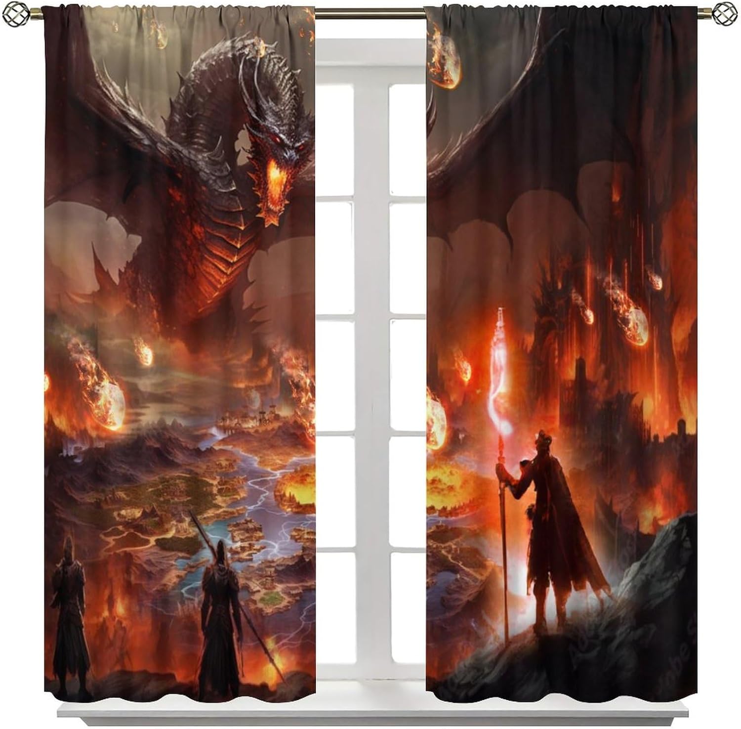Welcome to our store. Total size: 45" L × 42" W (114cm × 107cm),Includes two pieces,each of which measures:45" length × 21" width (114cm × 53.5cm). Total size: 54" L × 42" W (137cm × 107cm),Includes two pieces,each of which measures:54" length × 21" width (68.5cm × 53.5cm). Total size: 63" L × 42" W (160cm × 107cm),Includes two pieces,each of which measures:63" length × 21" width (160cm × 53.5cm). Total size: 63" L × 55" W (160cm × 140cm),Includes two pieces,each of which measures:63" length × 27.5" width (160cm × 70cm). Total size: 63" L × 63" W (160cm × 160cm),Includes two pieces,each of which measures:63" length × 31.5" width (160cm × 80cm). Total size: 72" L × 63" W (183cm × 160cm),Includes two pieces,each of which measures:72" length × 31.5" width (183cm × 80cm). Total size: 63" L × 72" W (160cm × 183cm),Includes two pieces,each of which measures:63" length × 36" width (160cm × 91.5cm). Total size: 84" L × 84" W (214cm × 214cm),Includes two pieces,each of which measures:84" length × 42" width (214cm × 107cm). The brebasf Vintage Mid Century Dragon curtains is the beautiful choice for bedroom.Good and Healthy materialOur Fantasy Ancient Castle Knight Burning Wildlife Dragon curtain is made from a safe and durable polyester fabric,a healthy choice for any living room.★ 95% polyester fabric.★ Easy to install. Easy to hang.★ Various style theme design,so that the bathroom is full of color and fun.Note1. Please allow a little bit of size deviation due to manual measurement.2. Due to differences in computer monitors,please allow a little bit of color difference between the picture and the object.3.Since curtains naturally gather when hung,to ensure a snug fit,we recommend that you purchase curtains that are slightly larger than your window size by 1.2 to 2 inches (3-5 CM).