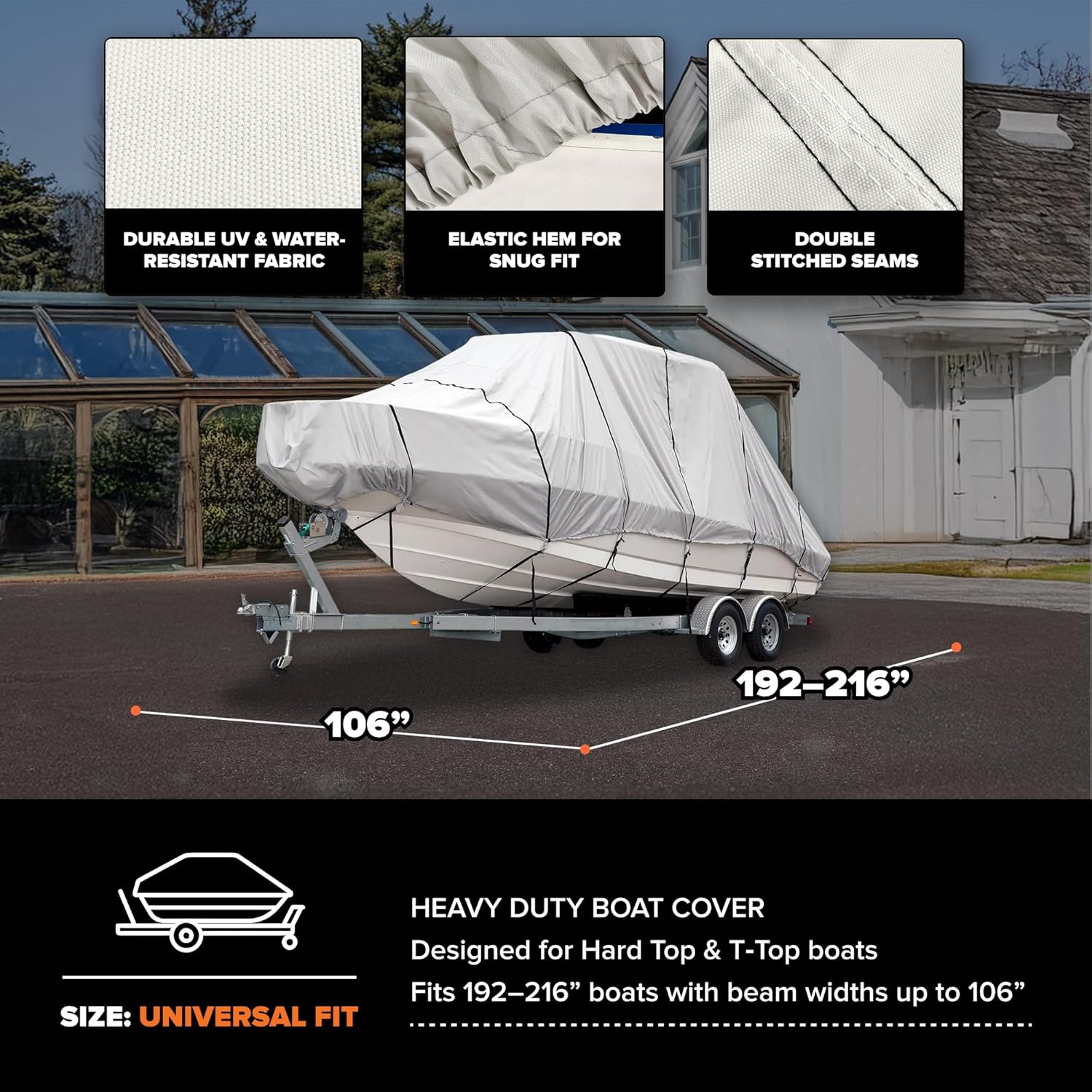 Budge Hard Top T-Top Boat Cover – Heavy Duty 600 Denier Protection Protect your vessel with confidence using the Budge 600 Denier Polyester Series, a waterproof boat cover built for all-weather defense. Made from heavy-duty 600 denier polyester, it shields against rain, sun, snow, dust, tree sap, and bird droppings, while UV-resistant fabric helps prevent fading and sun damage. It’s a dependable solution for boat owners seeking durable, long-term protection that extends the life of their investment. Constructed for strength, this trailerable cover features reinforced seams and rugged fabric that stand up to season after season of use. Breathable materials reduce heat buildup under the cover, helping preserve your boat’s upholstery and finish. A full elastic hem, sewn-in straps, and integrated buckles deliver a secure, semi-custom fit for storage or trailering. Lightweight yet strong, it’s easy to install, remove, and fold away. Each cover includes a carrying bag for convenient storage. The Budge Hard Top/T-Top Boat Cover delivers marine-grade protection for boats 22'-24' (264"-288") long with beam widths up to 106".