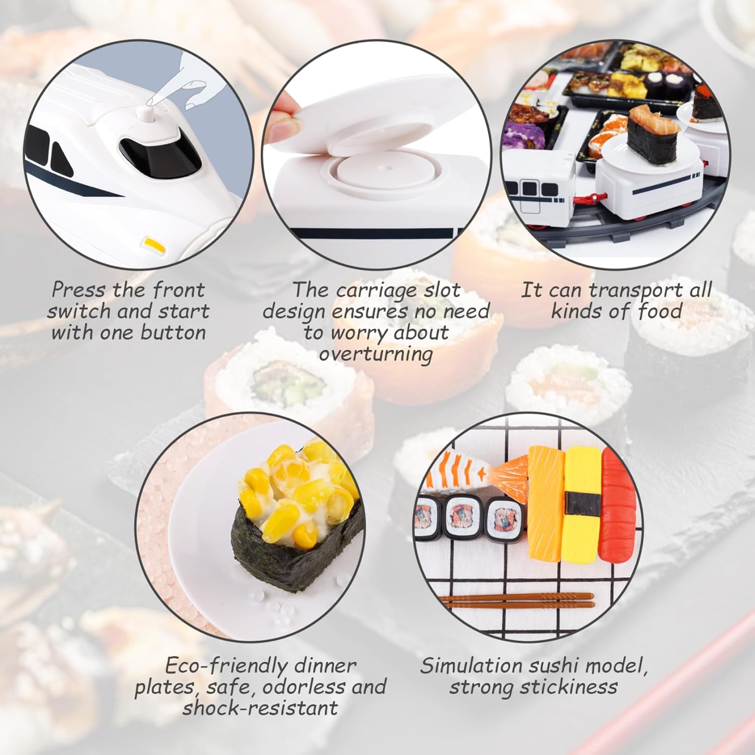 Description: As your favourite dishes and snacks circulate around the table, adding an of fun and novelty to your dining experience.The Sushi Train's rail conveyor system is not only aesthetically pleasing, but also ensures that your food is within, making it perfect for sushi, appetizers, desserts, or any canapés. The included tray fits conveniently on the train and allows you to elegantly present a variety of dishes to your guests. It's like having your own personal sushi chef. The small train table is battery-powered to ensure smooth, continuous rotation. There are no cords or outlets to worry about, making it suitable for any table setting. Whether you're hosting a dinner party, showcasing a culinary event, or simply enjoying a family meal, the Sushi Train will add an of excitement and elegance to your table. Features:. Sushi Train. -Color: As shown. -Material: ABS+Electronic Components. -Size:. Locomotive: 14x6cm/5.5x2.3 inches. Bracket: 12.5x4cm/4.9x1.5 inches. Curved track: 17x6cm/6.7x2.3 inches. Straight rail: 19x6.5cm/7.5x2.5 inches. Power source: 2xAA batteries (Not included). Suitable age: 3 years old and above. Note: Manual measurement, please allow slight errors on size. The colors may exist slight difference due to different screens. Package Including 1 * Locomotive, 5 * Carriage, 10 * Plate, 8 * Curved Rail, 8 * Straight Rail, 7 * Sushi, 1 Pair * Chopsticks