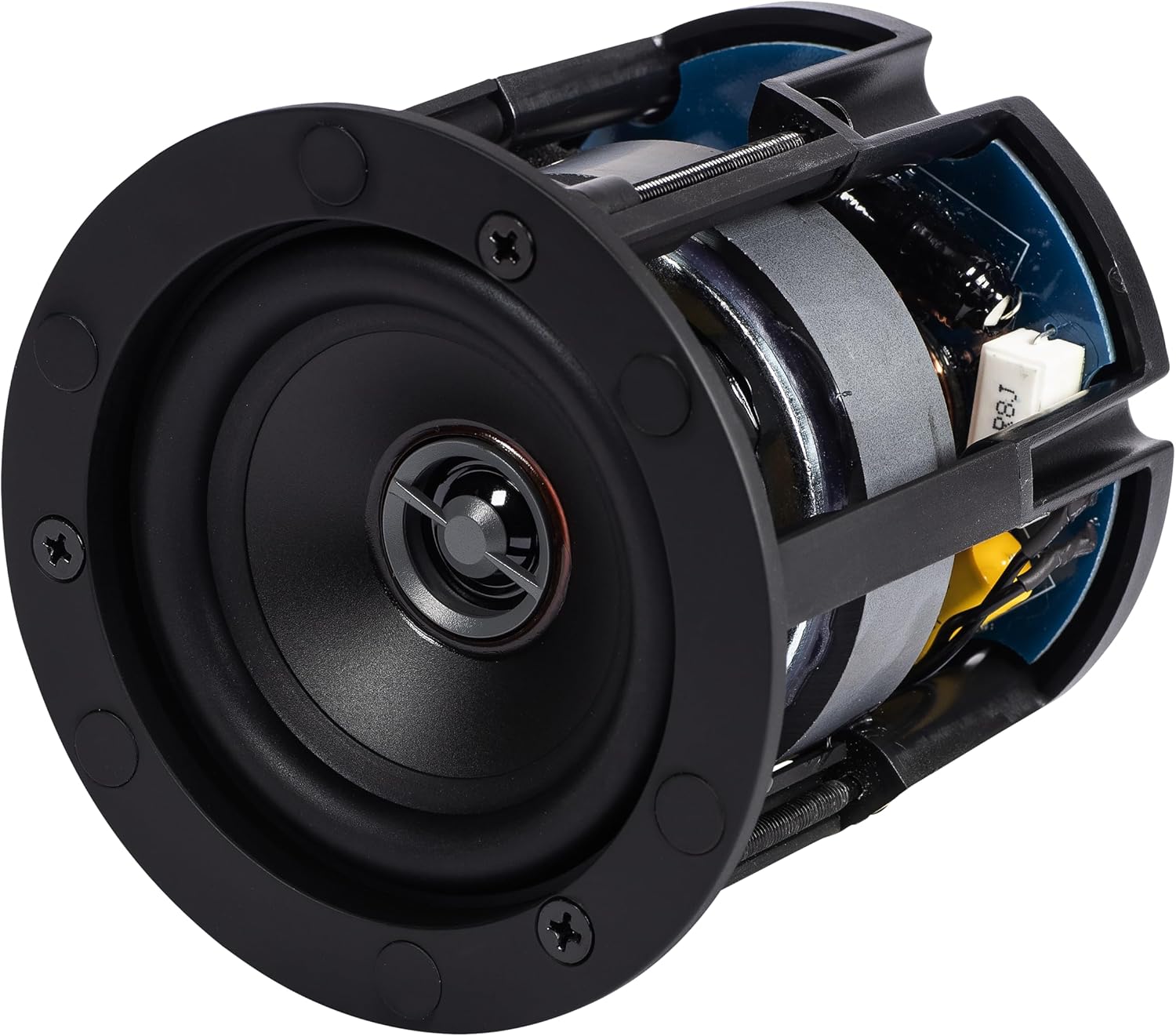 We understand the importance of having audio to enhance a living space, with minimal aesthetic intrusion. The easily installed Vertex Series I speakers utilize the same components throughout the series to ensure a perfect sonic match across the line. Keeping with our philosophy of delivering great sound, Vertex series I speakers will compliment any environment. Slim Profile A slim profile paintable magnetic grill allows for the speaker to virtually disappear in the room VERTEX SERIES IN-CEILING SPEAKERS FEATURES Custom Silk-Dome Tweeter Custom silk dome tweeters have been developed for low mass and smooth, extended high frequency response Custom-designed Woofers with Polypropelyne Cone Polypropylene is employed due to its improved internal damping and smooth high frequency roll-off Intricate Crossover A custom multi-element crossover with audio-grade components is implemented to ensure smooth transition between the drivers Accessory Products Optional square grill adapters are available to cosmetically match square lighting. Optional pre-construction brackets are available to aid in installation or use in ceiling tile applications. Specifications: Speaker type: 2-way, rear side open Tweeter: 3/4-inch soft dome Woofer: 3.8-inch polypropylene cone Crossover frequency: 3,000 Hz Frequency response: 76 to 20,000 Hz Sensitivity: 87 db at 2.83 v/1m Recommended amplifier power: 30 to 100 Watts Nominal/peak power handling: 50/80 Watts Nominal impedance: 6 Ohm Finish: Black baffle/White grille Grille: Metal magnetic / Paintable Accessories included: Cutout template, manual Dimensions (diameter): 4.25 in / 108 mm Cut-out (diameter): 4.00 in / 102 mm Mounting depth: 4.05 in / 103 mm
