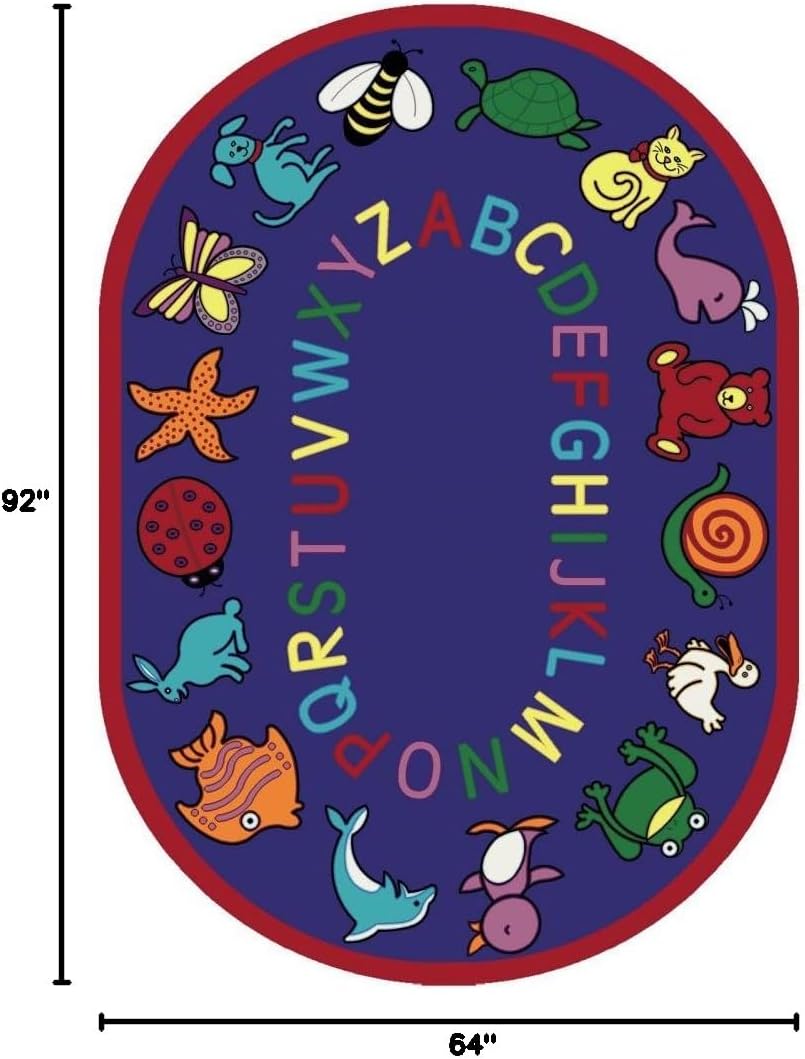 Nothing fancy, just good plain fun with this rug bordered by animals ranging from a blue dog to a yellow cat to a purple penguin. There are lots of places for children to sit during group discussion or story time. Perfect for early childhood.