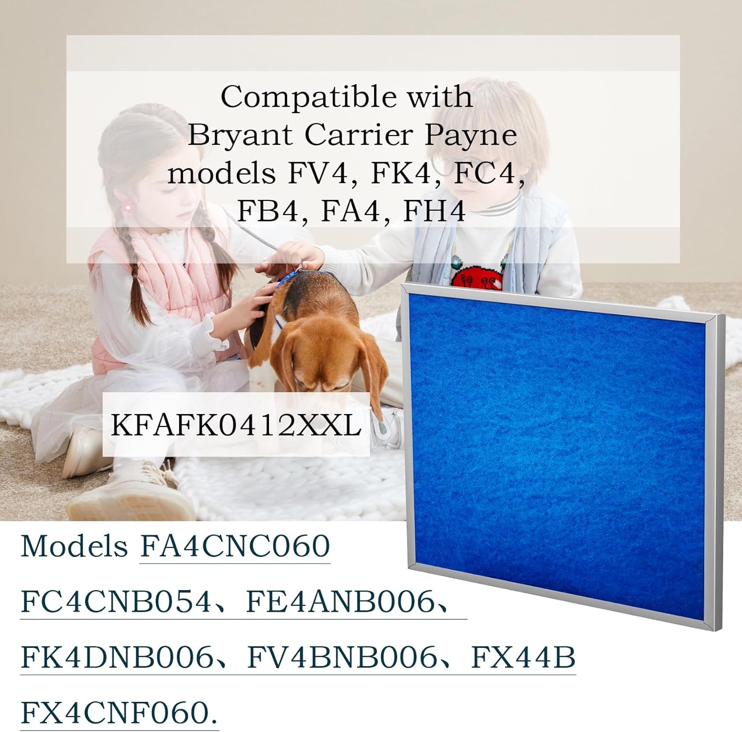 carrier kfafk0412xxl filter compatible with FV4, FK4, FC4, FB4, FA4, FH4. Fan coil filter KFAFK0412XXL fits air handler models FA4CNC060、FC4CNB054、FE4ANB006、FK4DNB006、FV4BNB006、FX44B、FX4CNF060, bryant kfafk0412xxl filter replacement is easy to replace.
