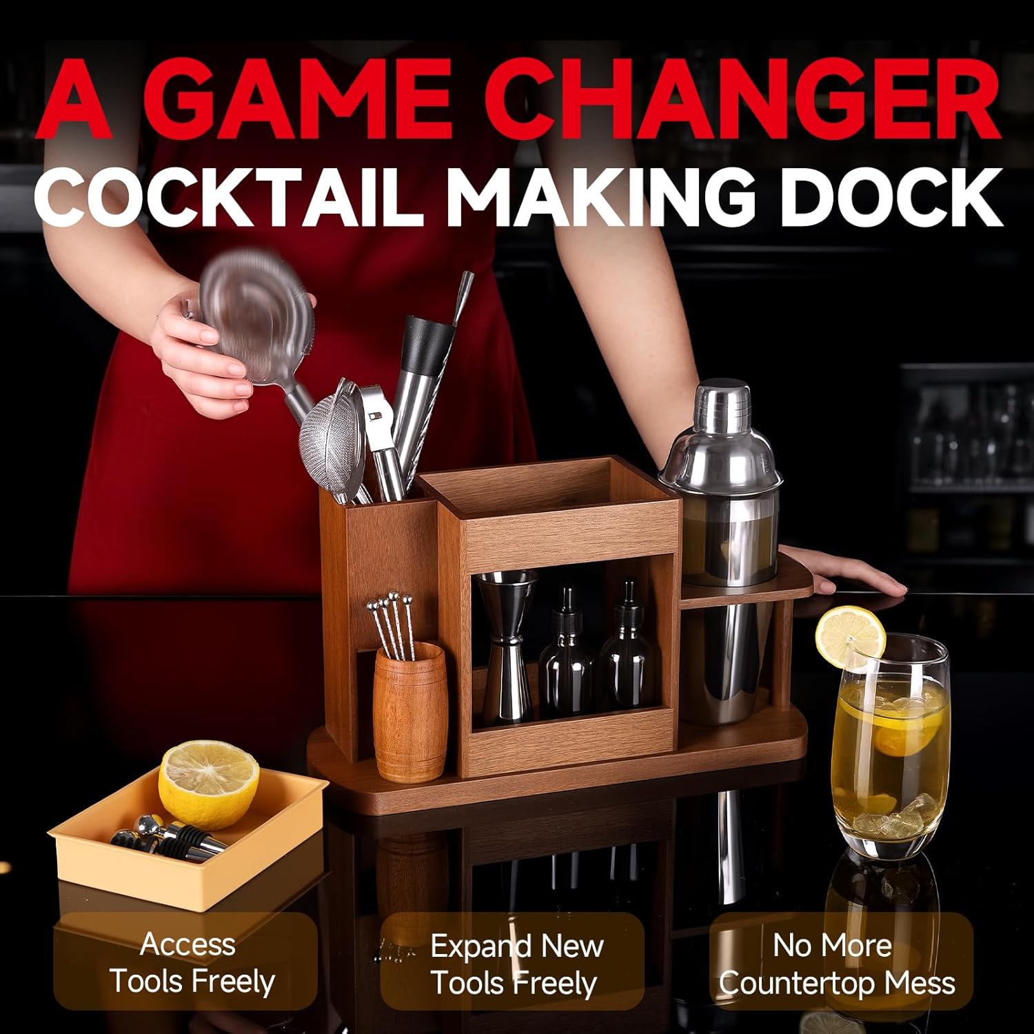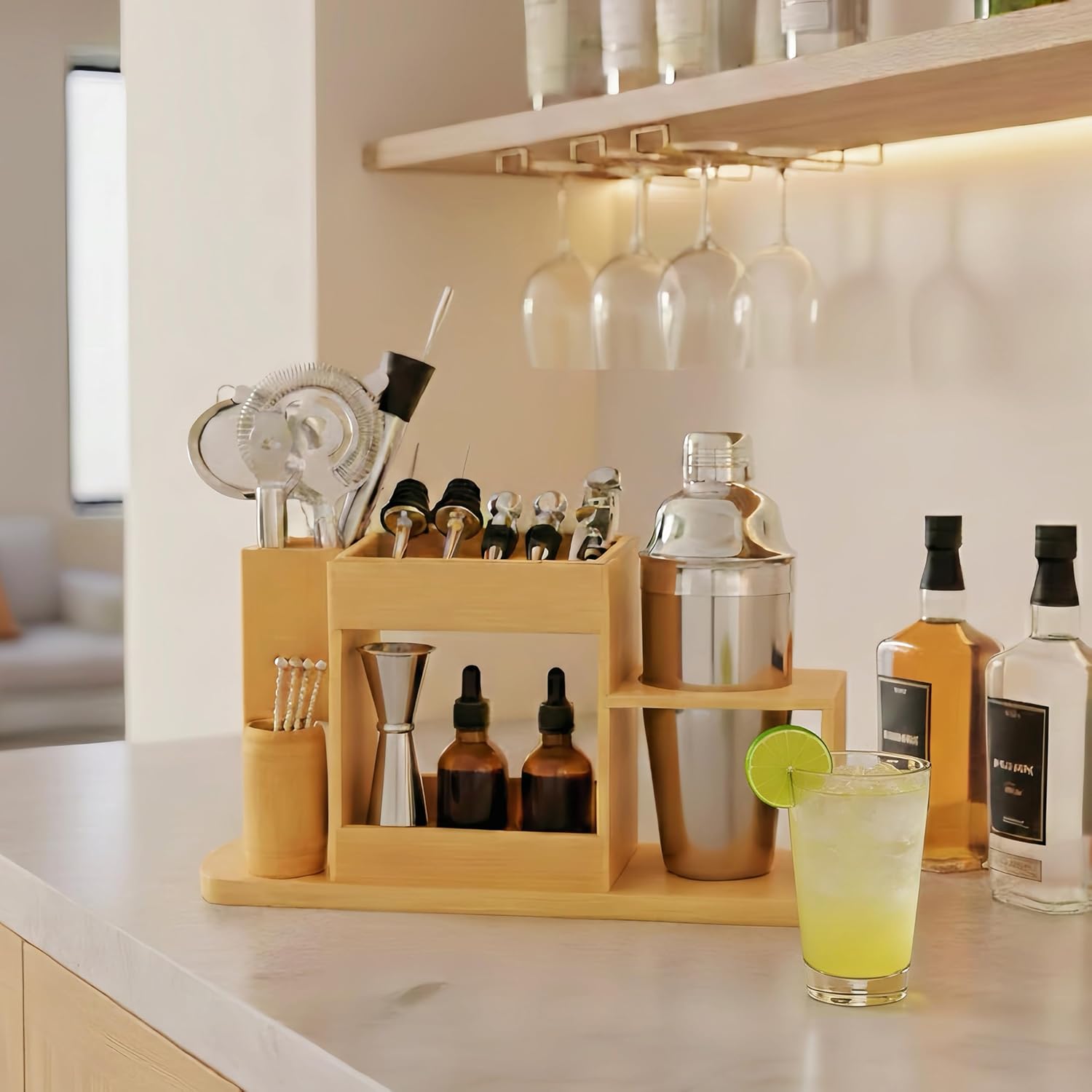 | Included Components | a bamboo stand, leak-proof shaker with lid, dual-sided 1/2 oz jigger, 8" muddler, 10" mixing spoon, cork opener, ice tongs, mesh strainer, lemon zester, hawthorne strainer, silicone tray for placing dirty tools, wood shelf, wood cocktail picks holder, 2 wine stoppers, 2 pour spouts, 2 drop bottles, 4 cocktail picks |
