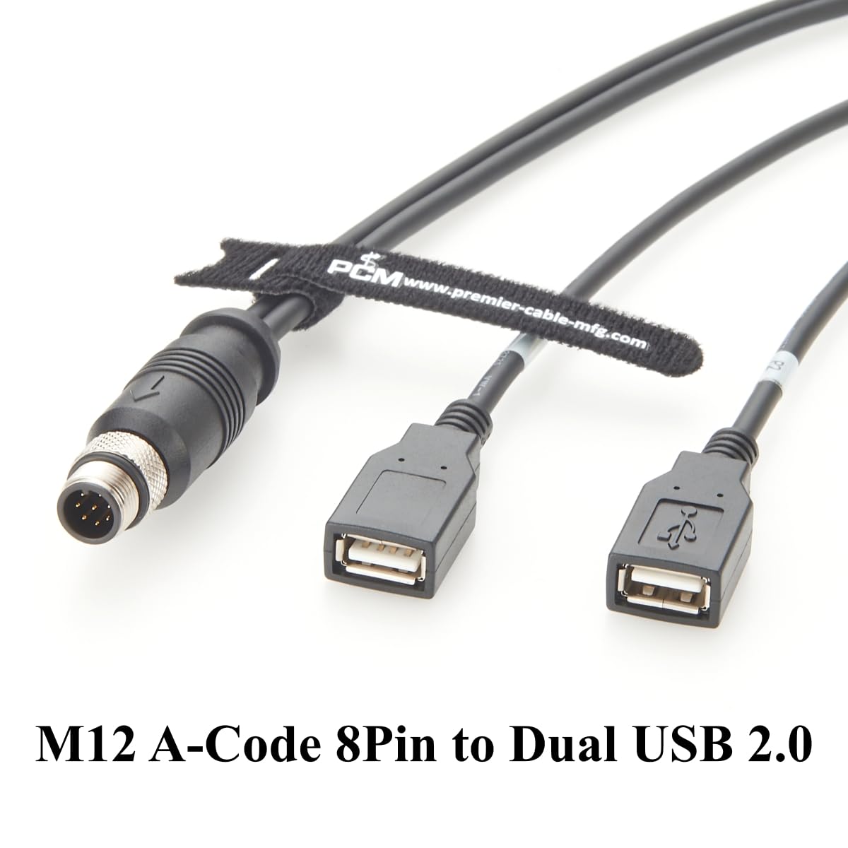 Specifications:Product Name: M12 A-Code 8Pin Male to Dual USB 2.0 Female Cable DWG No.: PCM-S-0653Connector A: M12 A Code 8 Pin MaleConnector B: Dual USB 2.0 FemaleLength: 3M/9.84FTOD: 4.5MMCable Gauge: 28AWG*1P+24AWG*2C+ADB, UL2725