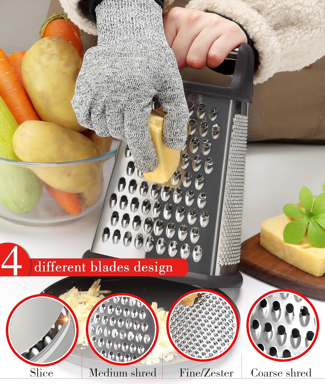 What you will get: 1.Box grater 2.Rotary cheese grater 3.Removable container 4.A pair of gloves 5.Vegetable peeler 6.Cleaning brushFeatures: - Box Grater: 1.Stainless Steel: Made from Germany, anti-rust and super sharp. 2.Anti-Slip Rubber Base: Keep the cheese grater steady when using. 3.Removable food storage: It fit the food grater and can collect the sliced food. 4.Easy to store: Turn the storage stuck it in the cheese shredder. 5.Multi-Function: 4 sides. 3 grating surfaces and 1 slicing blade. It is great for purple cabbage, cucumber, zucchini, potato, carrot, cheese, chocolate, biscuit, lemon, orange, coconut and so on. 6.Dishwasher Safe.- Rotary Mandoline Slicer: 1.BPA free plastic. Not easy to crack. 2.The rotary kitchen grater comes with slicing blade, coarse shredding blade and fine shredding blade. 3.430 Stainless steel blades: Made from Germany are anti-rust. 4.Stronger suction cup: we designed a larger suction cup especially to allows the vegetable chopper to catch your countertop tightly. Don’t worry about slip down while in use. 5.No electricity needed. Easy to clean and use. Don't need to worry about water entering the motor. 6.Package included a vegetable peeler and a cleaning brush.Rotary Shredder Installation Steps: It can be assembled in 30 seconds. 1.Put the base on a clean and smooth countertop, turn the knob from “RELEASE” to “LOCK”. 2.Install the transparent barrel on the base, then place the blade into the transparent barrel. 3.Align the connection port on the blade with the port on the handle and drop down the button on handle at the same time. 4.Release the button on handle, you can hear a snap, and it is installed. Now you can grating your ingredients. Warm Reminder: 1.Avoid prolonged soaking. 2.Please store them in a cool well ventilated places.
