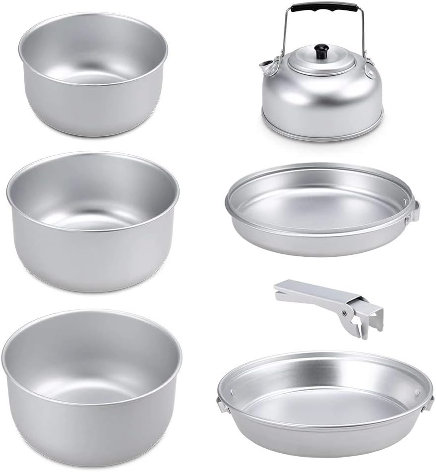 Model: Outdoor CookwareMaterial: AluminumBig Pot: 20.5 * 10.7cm / 8.1 * 4.2in; Weight: 161g / 5.7ozMedium Pot: 18.8 * 8.8cm / 7.4 * 3.5in; Weight: 123g / 4.3ozSmall Pot: 17 * 8.2cm / 6.7 * 3.2in; Weight: 70g / 2.5ozBig Pan: 21.5 * 4.2cm / 8.5 * 1.6in; Weight: 106g / 3.7ozSmall Pan: 18 * 3cm / 7.1 * 1.2in; Weight: 77g / 2.7ozKettle: 15 * 9.5cm / 5.9 * 3.5in; Weight: 150g / 5.3ozHandle Length: 12.8cm / 5.0in