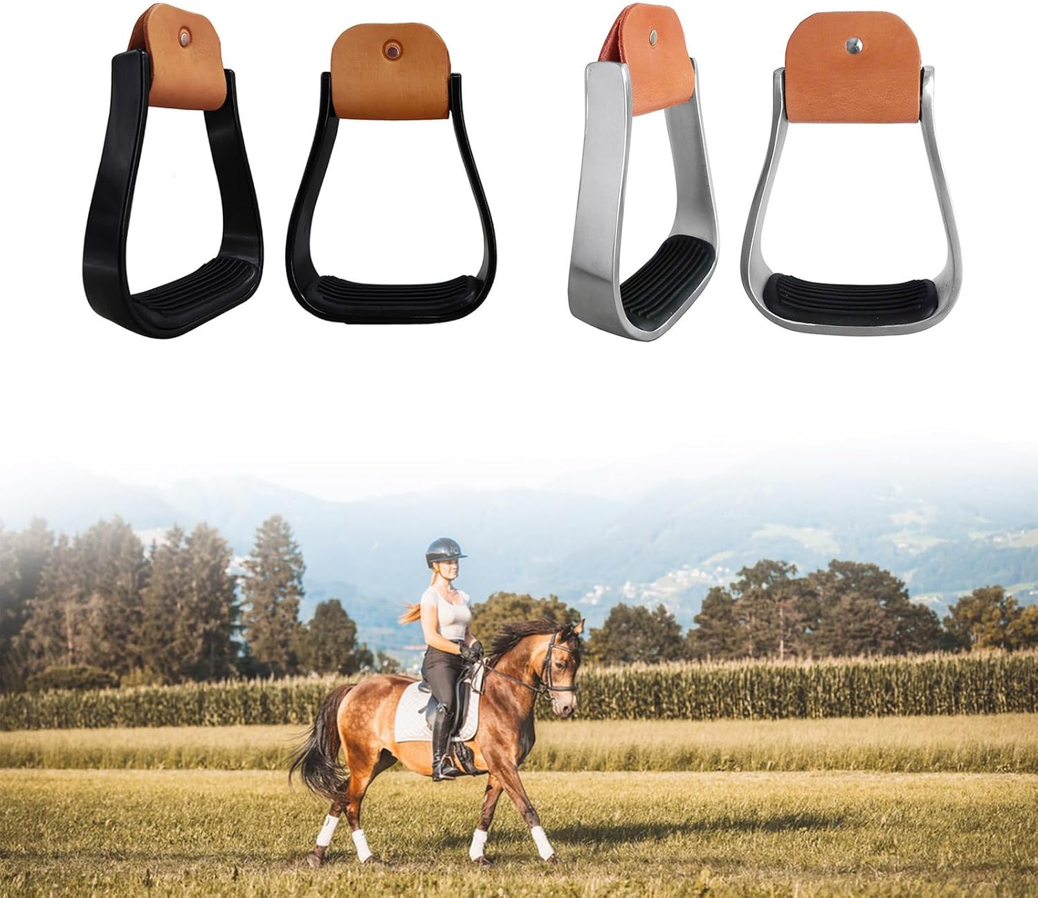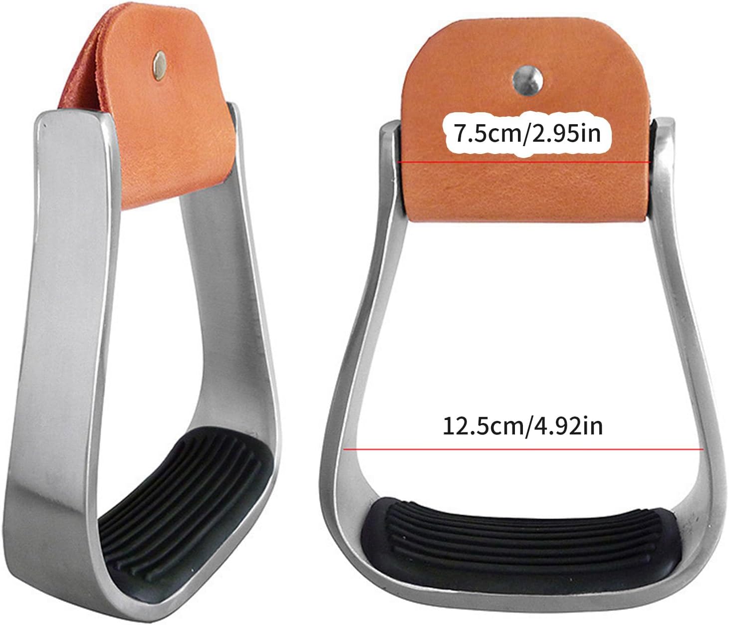 Professional Western Stirrups with Rubber Grip Mat, Aluminum Design for Stable Equestrian SportsFeatures:These Horse Stirrups are made from aluminum, strong and wear suitable for long term use.Feature antislip pedal design, providing stability and a great for your horse riding adventures.With inner width of 12.5 cm, they are suitable for most riders. They are and use.These Riding Stirrups are applicable to various equestrians activities such as horse riding.These Nonslip Stirrups make a practical accessory your family members or friend who love equestrians sports.Specifications:Component: AluminumColor: Black/SliveryInner Width: about 12.5cm/4.92inchPackage Includes:1pair Horse Riding StirrupsNote:Please allow 1-2cm errors due to manual measurement, make sure that you do not mind before you order. Due to the difference between different monitors, the picture may not reflect the actual color of the item.