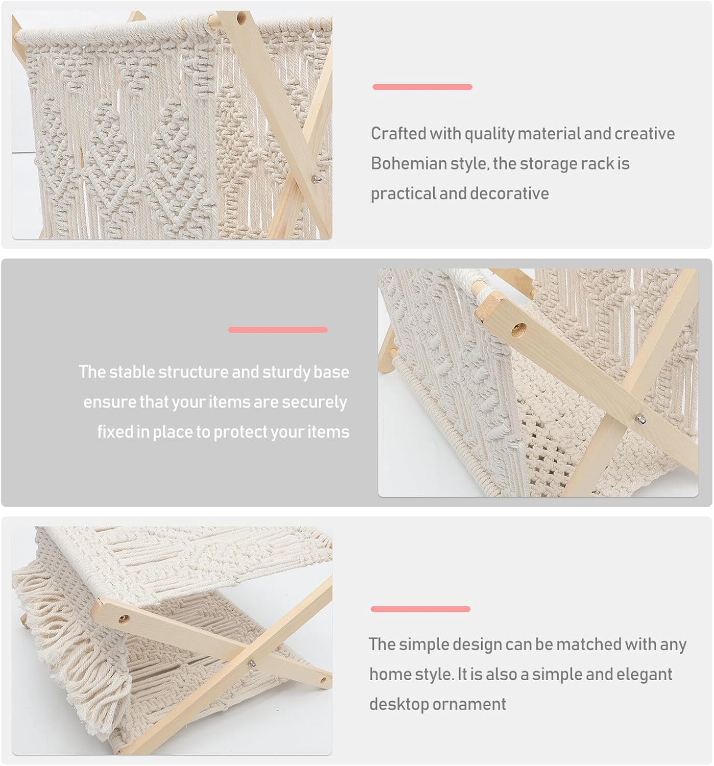 • Floor standing magazine rack:this sturdy rack is made from wood, and the material of the netting is cotton rope quality material is for use,magazine floor rack