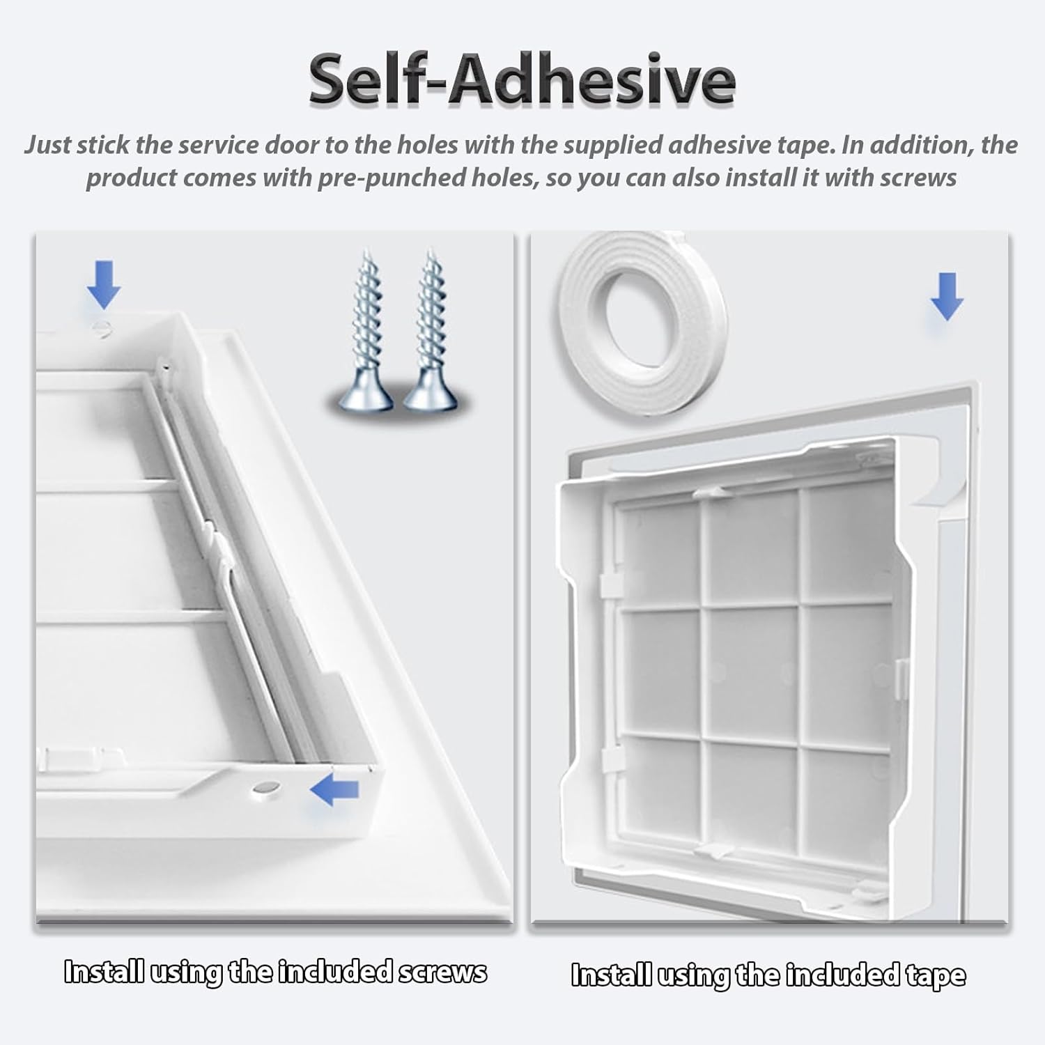Hidden design & seamless built-in access door, no more worries about exposed plumbing or holes. Keep the space clean, tidy, and easy to maintain.Specifications: - Material: Plastic- Width: 10cm - 40cm (3.9" - 15.8")- High: 10cm - 40cm (3.9" - 15.8")Features:- Self-adhesive design, peel and stick.- Hides unsightly holes and cables.- Plastic material ensures a durable access door.- Dustproof, easy to maintain, protects internal equipment.- Paintable design allows it to blend in better with the wall.- Suitable for repair areas on walls, floors and ceilings.- You can choose the color you need according to your preference.- Matches your interior design.Packaging List:- 1 x Access PanelNote:- Manual measurement may have length error, please understan.- Artificial shooting may cause a slight color difference, please prevail in kind.