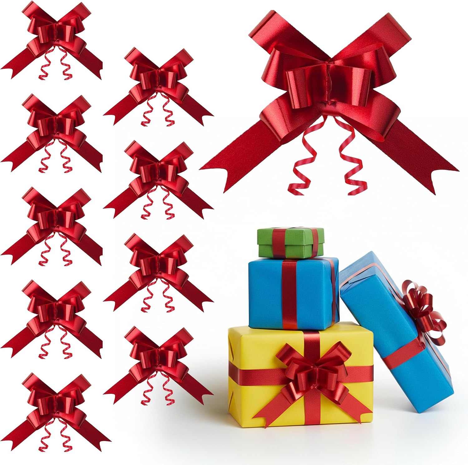 50mm quality large pull Bow Ribbon (approx 5" To 7" Wide when assembled) simply pull the inner ribbon cords and A beautiful bow is formed, tie off and attach with the extra long tie waterproof, anti static and wipe clean for use with fresh flowers and bouquets typical uses include creating bows and Decorating arrangements and gifts, flower bouquets and general craft work for wedding, anniversary, birthday. How the pull Bow works 1. Open tails to reveal the tie-strings. 2. Hold the tails open with one hand 3. Pull tie-strings with the other hand to form a bow. 4. Tie - strings at base of bow its that easy The bows will be delivered flat.