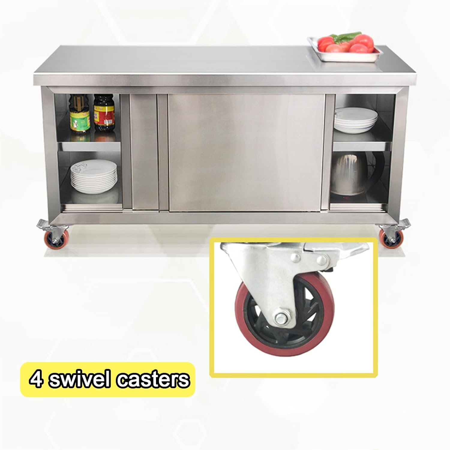 Name: WorkbenchMaterial: Stainless SteelColor: SilverContents Include: Workbench x1, Wheels x4 (Other items in the image are not included)Dimensions:80x60x78cm (31.5x23.6x30.7")100x50x78cm (39.4x19.7x30.7")100x60x78cm (39.4x23.6x30.7") 120x50x78cm (47.2x19.7x30.7")120x60x78cm (47.2x23.6x30.7")120x80x78cm (47.2x31.5x30.7")Features:1. Equipped with swivel casters featuring brakes. Lift to move, press down to lock—effortless.2. Storage cabinet features sliding doors. Open to reveal spacious storage capacitility.3. Rounded edge design on tabletop prevents hand injuries during use.4. Reinforced with stainless steel square tubing in middle and lower tiers for enhanced load capacitility.5. Adjustable leveling feet accommodate uneven surfacesVersatile Applications: for kitchens, schools, restaurants, factory workshops, warehouses, night markets, and hotels with heavy-duty load capacitilityImportant Notes:1. Dimensions are manually measured and may vary slightly. Colors may appear different due to shooting angles or lighting conditions.2. Stainless steel surfaces may exhibit minor scratches, which do not affect functionality.
