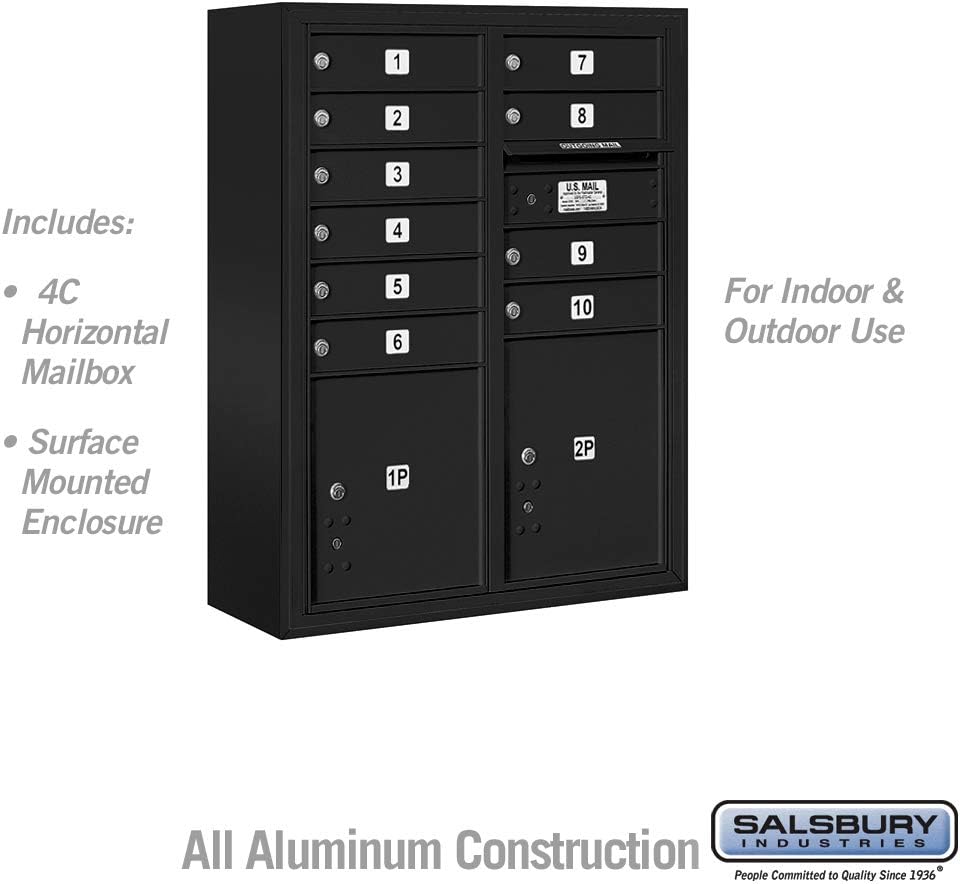 Made of heavy duty aluminum and stainless steel hardware, Salsbury 3800 series surface mounted 4C horizontal mailboxes are accessed from the front through one or two (2) easy opening master door panels. Surface mounted 4C horizontal mailboxes include a U.S.P.S. approved 4C horizontal mailbox and matching surface mounted enclosure and are available in configurations that are one door wide (single column) and two (2) doors wide (double column). The durable and corrosion resistant units feature a powder coated finish available in four (4) contemporary colors. Surface mounted 4C horizontal mailboxes are available with standard mailbox doors (MB1) that are 13-1/4'' W x 3-1/4'' H. All pre-numbered mailbox doors include a heavy duty cam lock with a dust/rain shield and three (3) keys. Each unit includes a compartment for outgoing mail collection and is labeled “Outgoing Mail”. The outgoing mail compartment includes a weather protection flap and an 11-3/4” W x 3/4” H mail slot. Fully integrated and stand-alone parcel lockers are available in heights ranging from the equivalent of three (3) standard MB1 mailbox doors (PL3 - 10-1/4" high) to six (6) standard MB1 mailbox doors (PL6 - 20-3/4" high). The Salsbury maximum height units (3816D-20) have two (2) fully integrated 15-1/2'' high parcel lockers (PL4.5) and twenty (20) standard MB1 mailbox doors and meet the U.S.P.S. 4C requirement of one parcel locker for every ten (10) tenant compartments. 4C receptacle bins and collection boxes are available in 10 door, 11 door and maximum height units. Surface mounted 4C horizontal mailboxes provide a convenient means of installing 4C horizontal mailboxes in locations where walls cannot accommodate a recessed mounted installation.