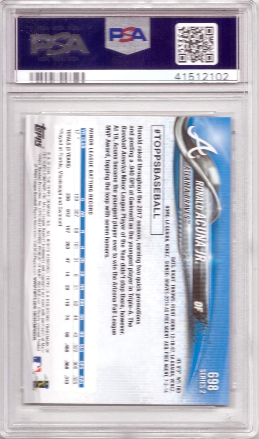 2018 Topps Baseball #698 Ronald Acuna Jr. Rookie Card Bat Pointing Up Graded PSA 10 Gem Mint - Atlanta Braves. This card could only be found inside 2018 Topps Complete Factory Sets. And since this card is professionally graded by PSA you can have peace of mind knowing that this is an original, authentic card (not a reprint or a counterfeit) made by Topps in 2018 and that the condition grade of Gem Mint is accurate. In addition, this card features the official RC logo, indicating that this is a true Rookie Card of Ronald Acuna Jr. Card shown is a stock photo. Actual card is very similar with the exception of the PSA serial number.