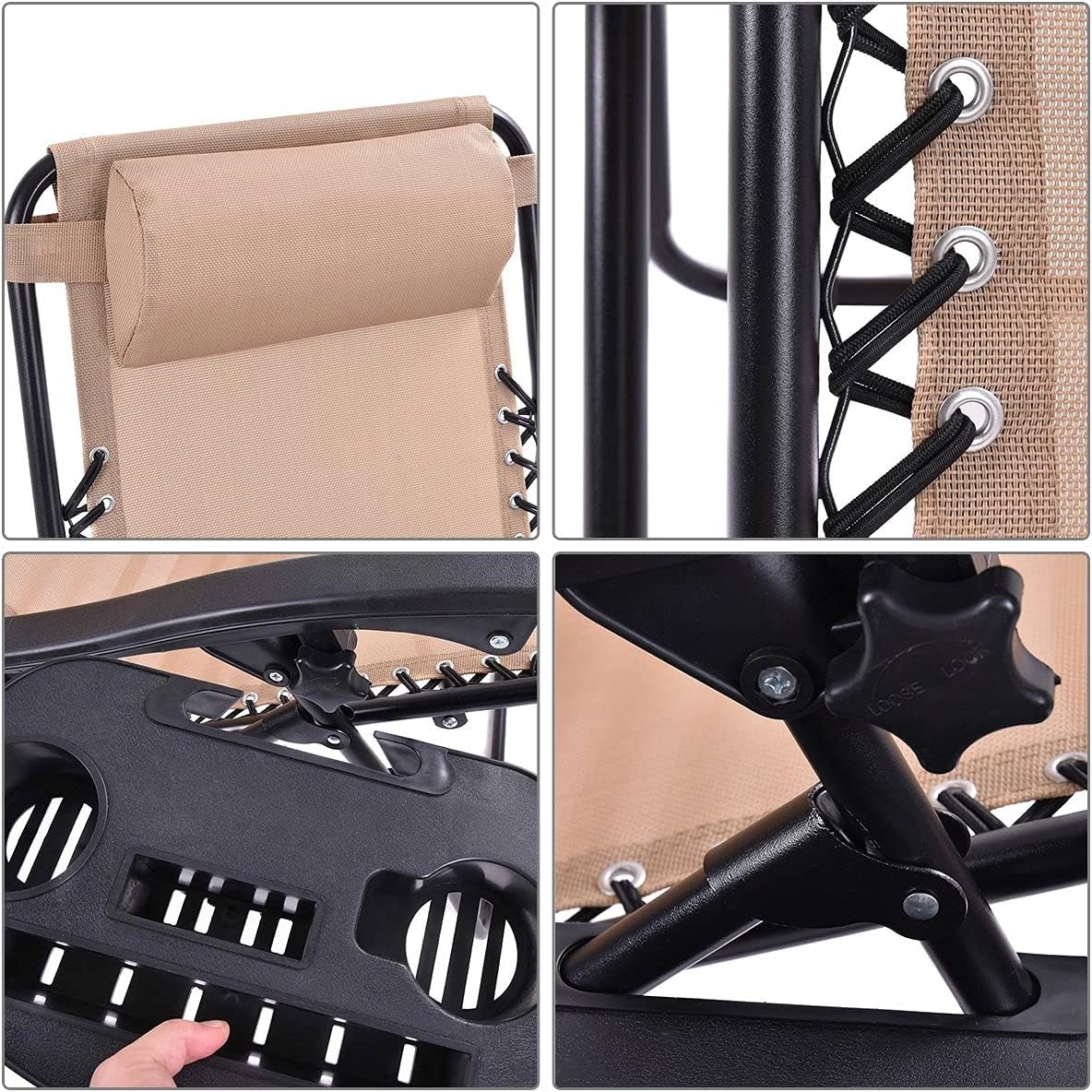Description:Our patio recliner chair is a great addition to your coziness and happiness!This patio recliner chair is crafted with solid steel frame and thickened fabric that present you a sturdier and more stable chair. The soft pillow and ergonomic backrest can provide you with more comfortable and pleasant sitting experience. It can also be folded to save much space when you don’t use it. It is suitable for living room, garden, balcony and so on.Features:Manufactured with solid steel frame ensures stabilityThickened fabric allows it to serve a long timeStable and sturdy chair body can hold up to 300lbsErgonomic design to make sure you have the optimum comfortElastic backrest helps reduce your muscle tensionAdjustable and replaceable headrest helps relieve tirednessDesigned to be foldable to save storage spacePortable design allows easy carrying-outSpecifications:Material: Fabric + Steel + PlasticOpen Dimensions: 35.5” - 65” (L)× 26” (W) ×44.5” (H)Folding Dimension: 37.5” (L)× 26” (W)× 6” (H)Net Weight: 33lbsWeight Capacity: 300lbsPackage Includes:2×Recliner Lounge Chairs1×Instruction Manual
