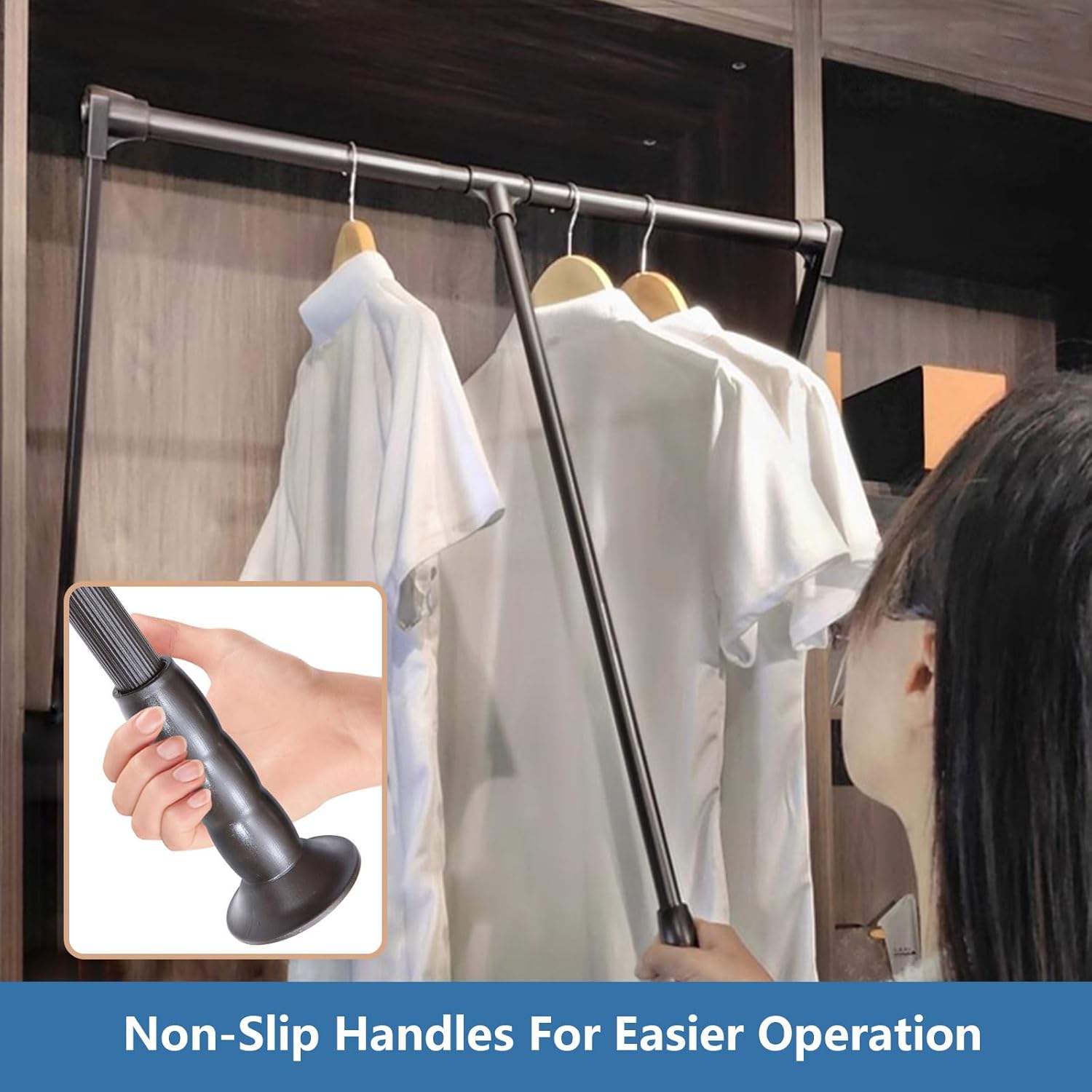 This folding wardrobe rail can be mounted inside the wardrobe to make the best use of available space. The retractable wardrobe bar can be pulled down to hang or pick up the very top cabinet garment. This adjustable coat rack to support maximum weight of 30 kg.Name: Folding Wardrobe RailMaterial: Aluminum material + ABS resinFunctions: hydraulic cushion, active returnDamping buffer adopts advanced labor-saving device, easy to pull downAdjustable left and right widthThe crossbar can be adjusted left and right,Rotating telescopic design,Meet the needs of different cabinetsThe inner width of the cabinet is 550~700mm, choose 550~700mm TypeThe inner width of the cabinet is 700~930mm, choose 700~930mm TypeThe inner width of the cabinet is 930~1250mm, choose 930~1250mm Type package:1*Folding Wardrobe Rail