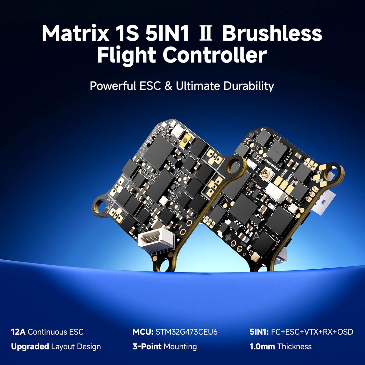 Specifications FC MCU: STM32G473CEU6 Gyro: ICM42688P Blackbox memory: 16MB Sensor: Voltage & Current BEC: 5V, Max 3A UART: UART 1, UART 2 (For VTX), UART 3 (For RX), UART 4 BetaFlight OSD: AT7456E ESC: 12A continuous RX:Serial ELRS 2.4GHz (V3.4.3) VTX: 5.8G 48 channels, Max 400m FC firmware: Betaflight_4.5.3_BETAFPVG473_V2 USB port: SH1.0-4Pin Motor connector: JST1.25 Battery connector: BT2.0 Mounting hole size: 26mm x 26mm Weight: 4.1±0.1g (solder-free) ESC Power input: 1S Only Current: 12A continuous, 18A peak ESC firmware: A_X_5_96KHz_V0.19.hex for BB51 Bluejay firmware Digital signal protocol: DShot300, DShot600 VTX Output power: 25/100/200/400/PIT Frequency: 5.8G 48 channels, with Raceband: 5658~5917M Channel SEL: SmartAudio2.0 Modulation type: FM Frequency control: PLL All harmonic: Max -50dBm Frequency stability: ±100KHz (Typ.) Frequency precision: ±200KHz (Typ.) Channel carrier error: ±1.5dB Antenna port: 50 Ω Operating temperature: -10℃~80℃ Package 1 * Matrix 1S 5IN1 II Brushless Flight Controller (Solder-free Version) 1 * Type-C to SH1.0 Adapter 1 * SH1.0-4Pin Adapter Cable 1 * 5.8G Antenna 4 * M1.2*4 Self-tapping Screws 4 * M1.4*5 Self-tapping Screws 4 * Shock Absorbing Balls
