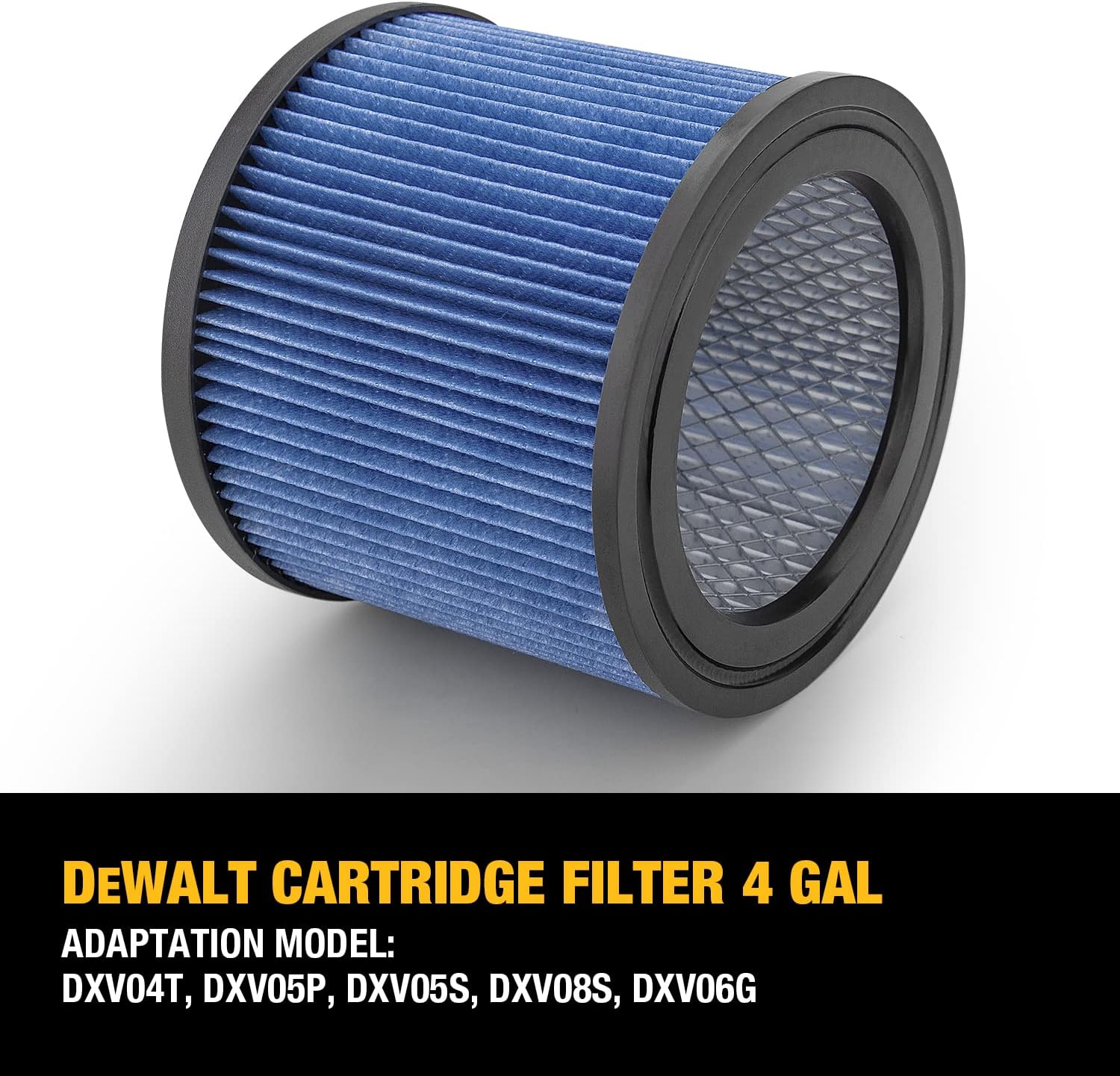 DEWALT DXV04T Portable 4 gallon Wet/Dry Vaccum, YellowThe 4 gallon wet dry vac is portable and easy to bring to any job with it's convenient toolbox shape and easy carry handle. With a powerful heavy duty motor for industry leading performance, This vac provides maximum suction power for heavy duty pickup. It arrives with a dust cartridge filter for small, dry debris and wet materials, strong handle for easy carrying, large on/off switch with water-resistant design for safe and Quick access, convenient, built-in 20’ power cord and accessory storage to get all your accessories/tools organized.DeWalt DXVC4002 High Efficiency Cartridge Filter, Fit for 4 Gallon Wet/Dry Vacuum Cleaners, Compatible with DeWalt DXV04T, DXV05P, DXV05S, DXV08S, DXV06G Wet/Dry Shop VacuumsThis DeWalt fine dust cartridge filter fits the DeWalt 4 gallon wet/dry vac. The filter easily connects to the 4 gallon vac with the Patent pending clean connect locking system, allowing the filter to be installed safely and securely.