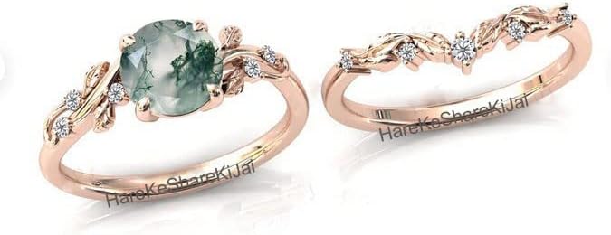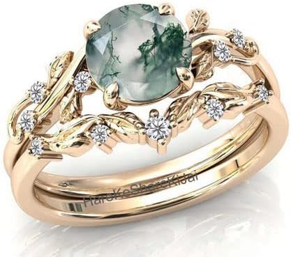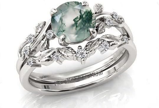 Celebrate love with this Moss Agate Engagement Ring Set for Women, a timeless piece that blends elegance and nature’s beauty. The centerpiece features a natural round moss agate gemstone with mesmerizing green inclusions, each stone being one-of-a-kind. Crafted from solid 925 sterling silver and finished with black rhodium plating, the ring boasts a vintage leaf and vine design that symbolizes eternal love and growth. This 2-piece bridal set includes an engagement ring and a perfectly matching wedding band, offering a harmonious and elegant style for your special day. Whether as a wedding ring, promise ring, or anniversary gift, this set is a lasting expression of love. Comes ready in a gift box for a memorable presentation