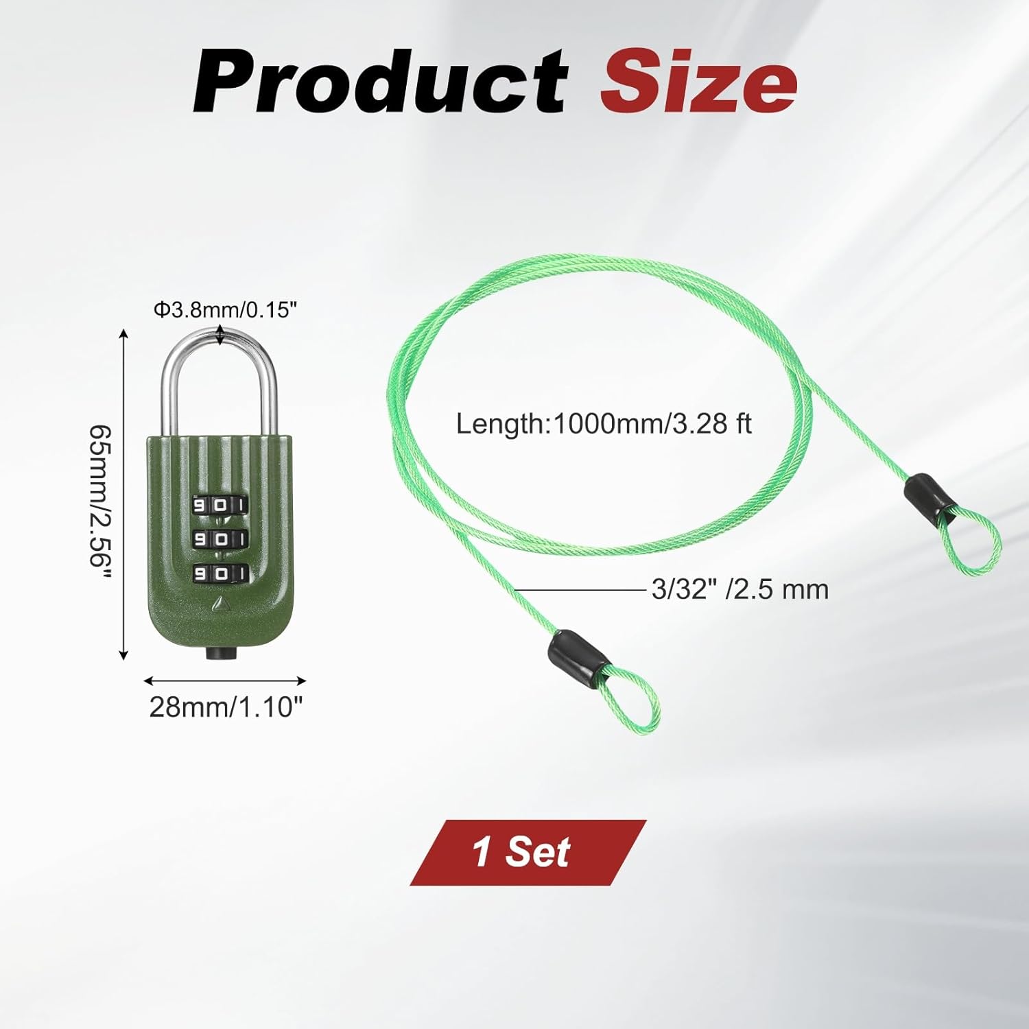 Reasons for Selection - Double loop security cable is crafted from premium stainless steel, which features rust prevention, corrosion resistance, high toughness and aging resistance. Equipped with a zinc alloy 3-digit combination lock, the password wheel rotates smoothly without jamming, allowing it to be opened without a key and providing reliable protection.Measurement - Steel Cable Size: 1000 x 2.5 mm / 3.28 ft x 3/32 inch (L*D); Combination Size: 28 x 65 mm / 1.10 x 2.56 inch (W*H); Shackle Diameter: 3.8 mm / 0.15 inch; Package Include: 1Pcs x Steel Cable and 1Pcs x 3 Digit Combination Lock.Suitable for - Bicycle cable lock is suitable for locking helmets, bicycles, motorcycles, sports equipment, fences, toolboxes, suitcases, etc., effectively preventing loss and ensuring the safety of your belongings, which can also be used as a clothesline, net hanging device, animal leash and binding strap.Installation - The default combination is 000. Press and hold the reset button into the slot, then enter your new combination. Thread the security steel cable through the items you need to secure, and then lock it with a lock.Kind Tips - Please confirm the size before purchasing. It is recommended to apply lubricant regularly to extend the lock's lifespan.