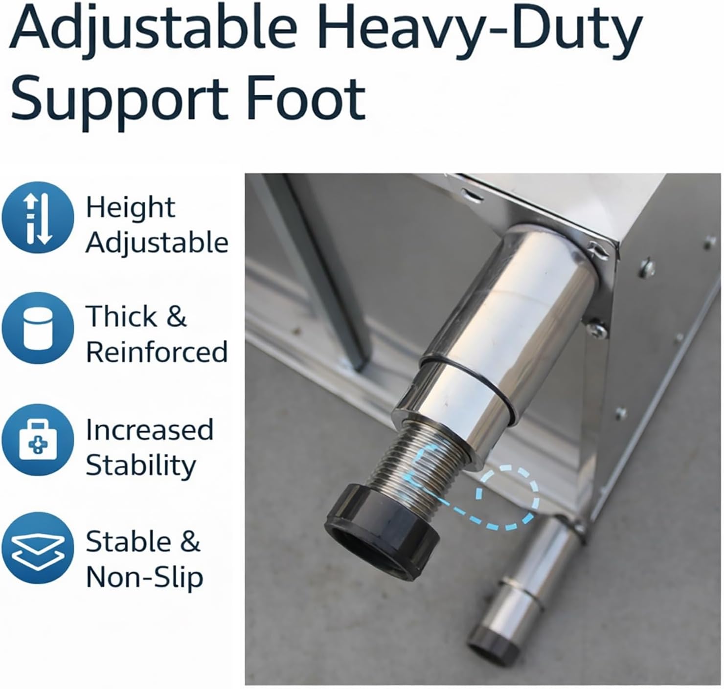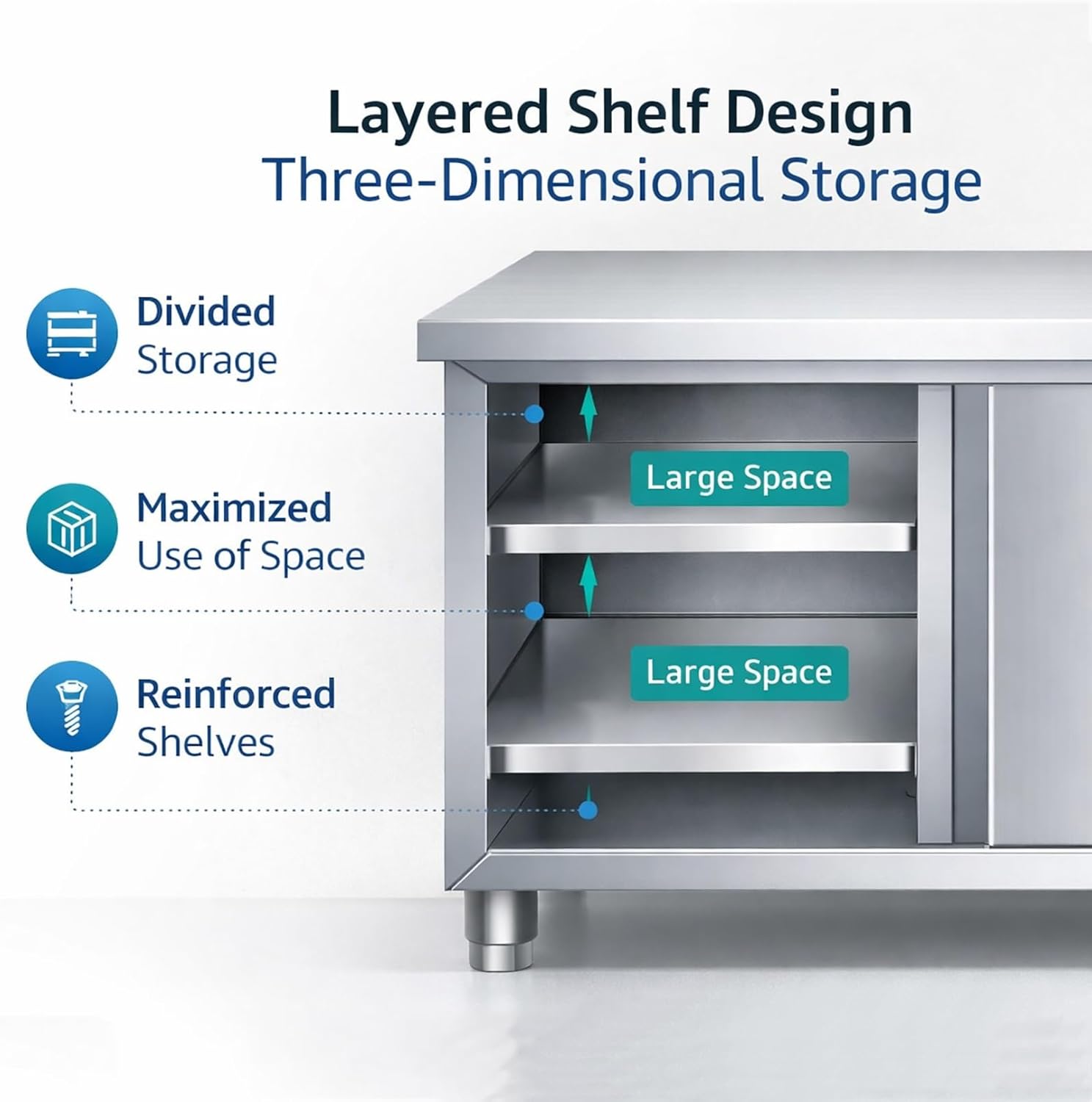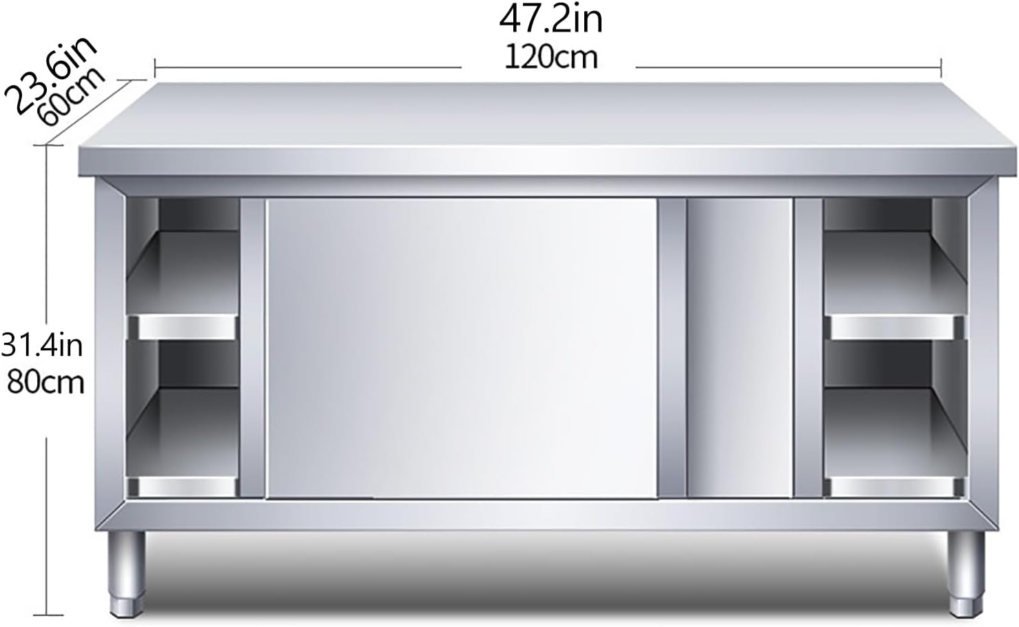 This premium stainless steel kitchen island is perfect for both home and commercial use, whether you're looking for a kitchen work table, outdoor kitchen island, or prep table with storage. Constructed from top-grade stainless steel, offering a sleek finish that's easy to clean and ideal for food preparation or heavy-duty tasks. The spacious worktop provides ample room for meal prep, garage projects, or as a workbench for garage needs.The table features a dual-tier cabinet with sliding doors, providing convenient, safe storage for kitchen tools, equipment, or supplies. Whether you need a kitchen cabinet or a stainless steel kitchen island, this design maximizes space and organization.Plus, its elevated feet make it easy to clean the floor underneath, maintaining a hygienic workspace. The adjustable legs ensure stability, even on uneven surfaces, making it suitable for any environment.Ideal for commercial kitchens or home setups, this stainless steel prep table with wheels offers durability and functionality. Whether for a commercial stainless steel table, prep table for commercial kitchen, or worktables & workstations, this versatile table meets all your needs.