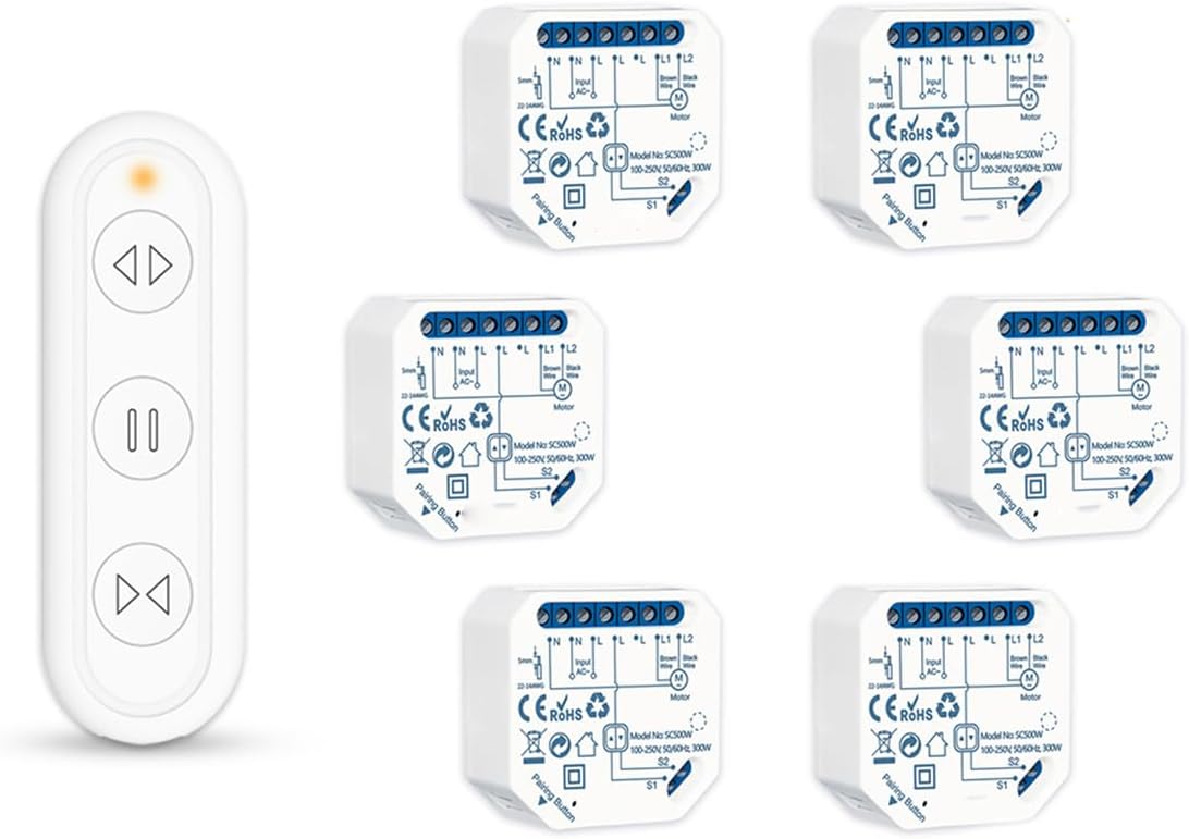 Wattage:300WVoltage:110-240VModel Number:SC511WSCOrigin:Mainland ChinaCertification:CE,RohsAPP Name:Smart Life,TuyaSupport System:Both Android And IOSWireless Protocol:Wi-Fi 2.4GhzSwitch Type:Switch ModuleCompatible With:AC Electic Motor With 4 WiresRemote Control Range:Up To 30M:App ScheduleConnect With:Electric Motor , Any BrandWorks With:Blinds Shutter With Electric MotorDIY:Smart Home, Home AutomationShutter Control:Remote ControlNote before order! The module can be compatible with any electric shutter motor with 4 wires,(Live Wire 1, Live Wire 2, Neutral Wire, Earth Wire), and 100-250 VAC voltage input, But the live wire 1, liver wire 2 (for open and close )and neutral wire these 3 wires must be required for installation, otherwise it can't connect with our switch. Before using App to control the shutter, please keep the wall manual switch at 'STOP' position, otherwise , the App can't work, it's to protect the motor. WiFi Shutter Switch Module with RF Remote Control Switch Multi ways to control the electrical curtain blinds App Remote Control ( Open, Pause, Close) Use a Manual Remote to control the curtain blinds, ( Open, Pause, Close) Control Range up to 30m Voice control can be achieved through smart home devices (speakers), (OPEN, CLOSE, and you can make a scene in smart life App to stop the curtain) Built in RF module, enable you can remote control your blinds shutter even if you have trouble with WIFI The remote is with a wall mount, you can also mount it on wall where would be convenient for you.